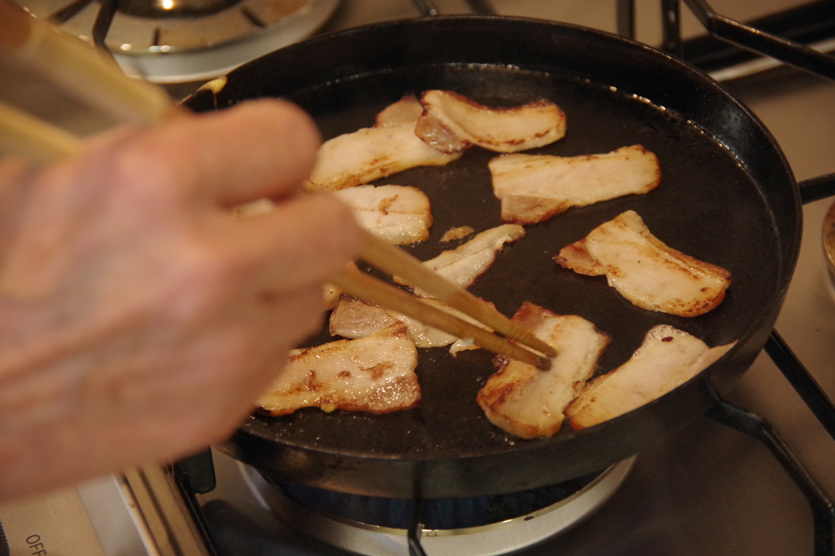 塩糀(こうじ)にじっくり漬け込み、旨みを最大限に引き出した、手作りならではの無添加ベーコン。南部鉄器のフライパンで焼く香りがもう・・・たまりません!!
